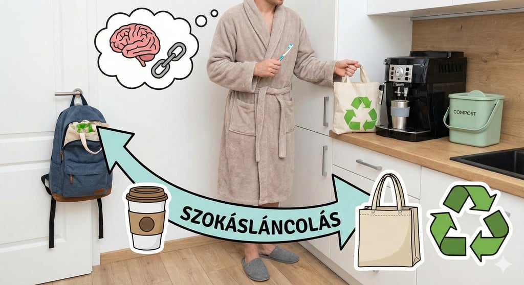 A fenntarthatóság gyakran azért bukik el a hétköznapokban, mert plusz mentális terhet jelent. Döntéseket kell hozni, észben kell tartani dolgokat. Itt jön a képbe a szokásláncolás (habit stacking), az egyik leghatékonyabb viselkedéspszichológiai módszer, amivel a környezettudatosságot robotpilóta-üzemmódba kapcsolhatod.